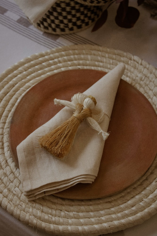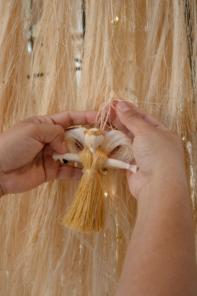 La fibra del henequén, agave nativo de la península de Yucatán, ha sido utilizada por los mayas desde épocas prehispánicas por su composición resistente y duradera. El henequén costurado es una de las técnicas que nace del uso del material, en donde las fibras húmedas y peinadas se enrollan circularmente formando capas que se cosen entre sí para construir objetos cotidianos.