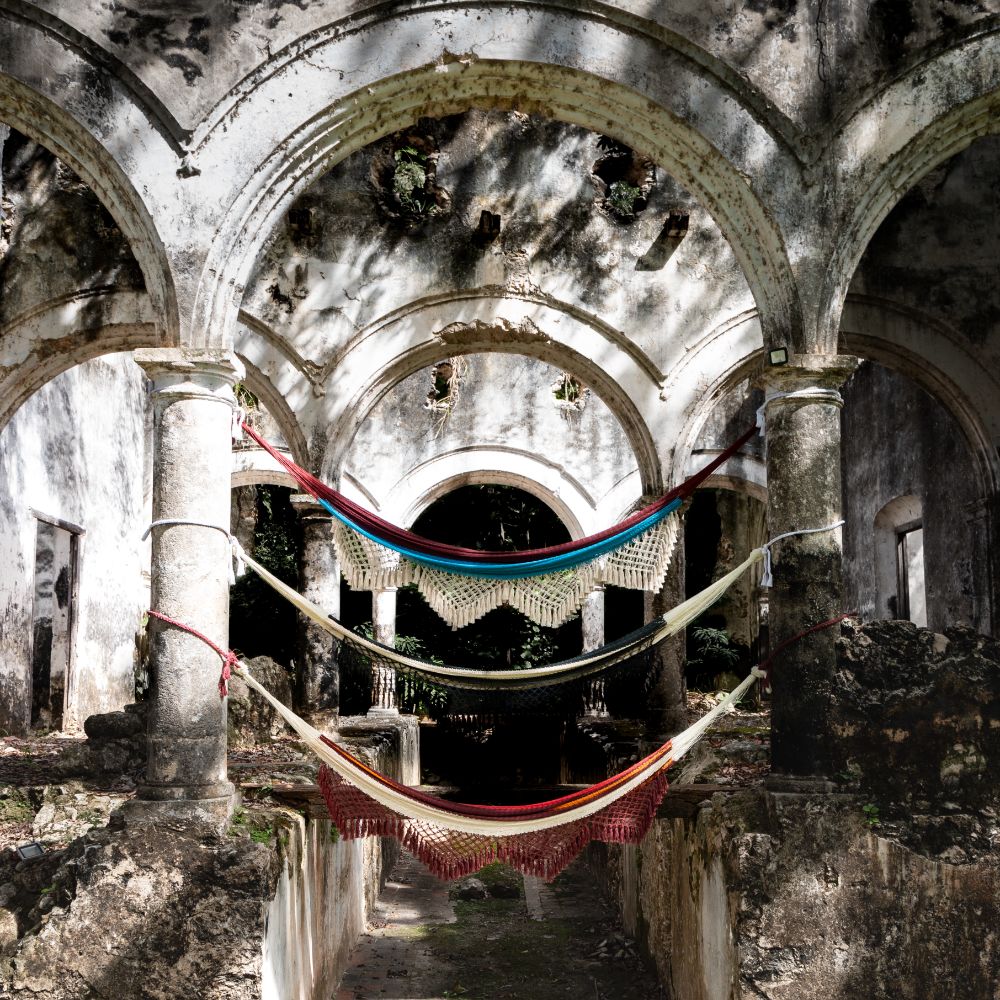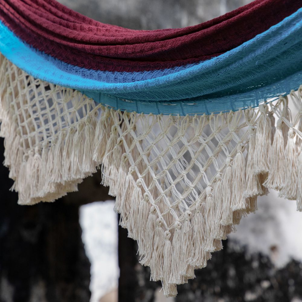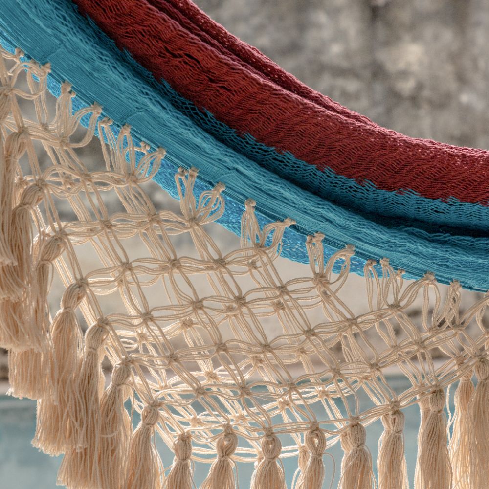 La hamaca Carretera combina azul, vino y crudo en un diseño inspirado en caminos inexplorados. Tejida con puntada simple y macramé, proviene del taller Kaamabal Kuxtal (Yaxunah, Yucatán), donde 15 artesanas mayas reflejan su maestría y tradición.