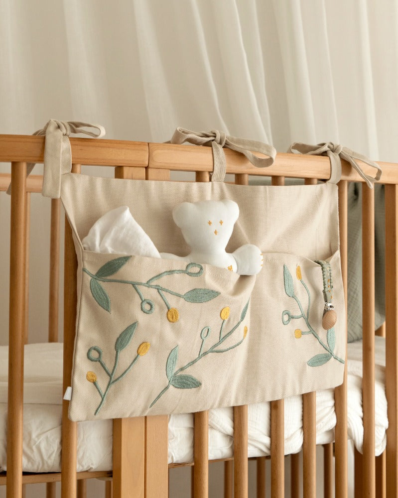 El Cunero Lipia es un organizador textil que combina funcionalidad y belleza en el espacio del bebé. Diseñado para colgarse fácilmente en la cuna, cuenta con bolsillos prácticos que permiten guardar lo esencial: pañales, baberos, juguetes pequeños o accesorios de uso diario.