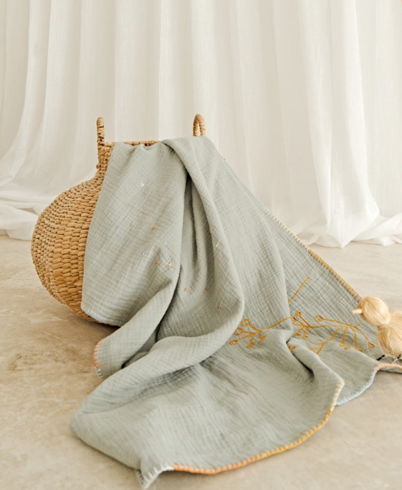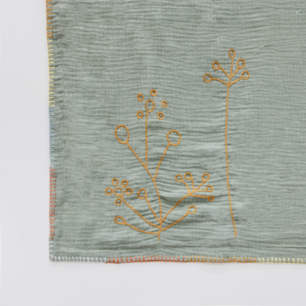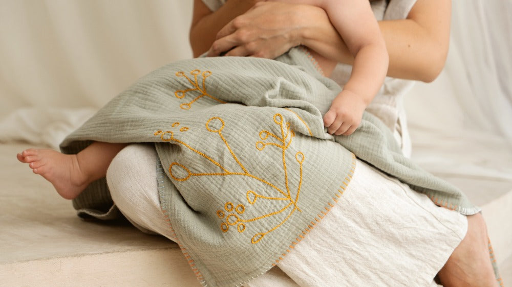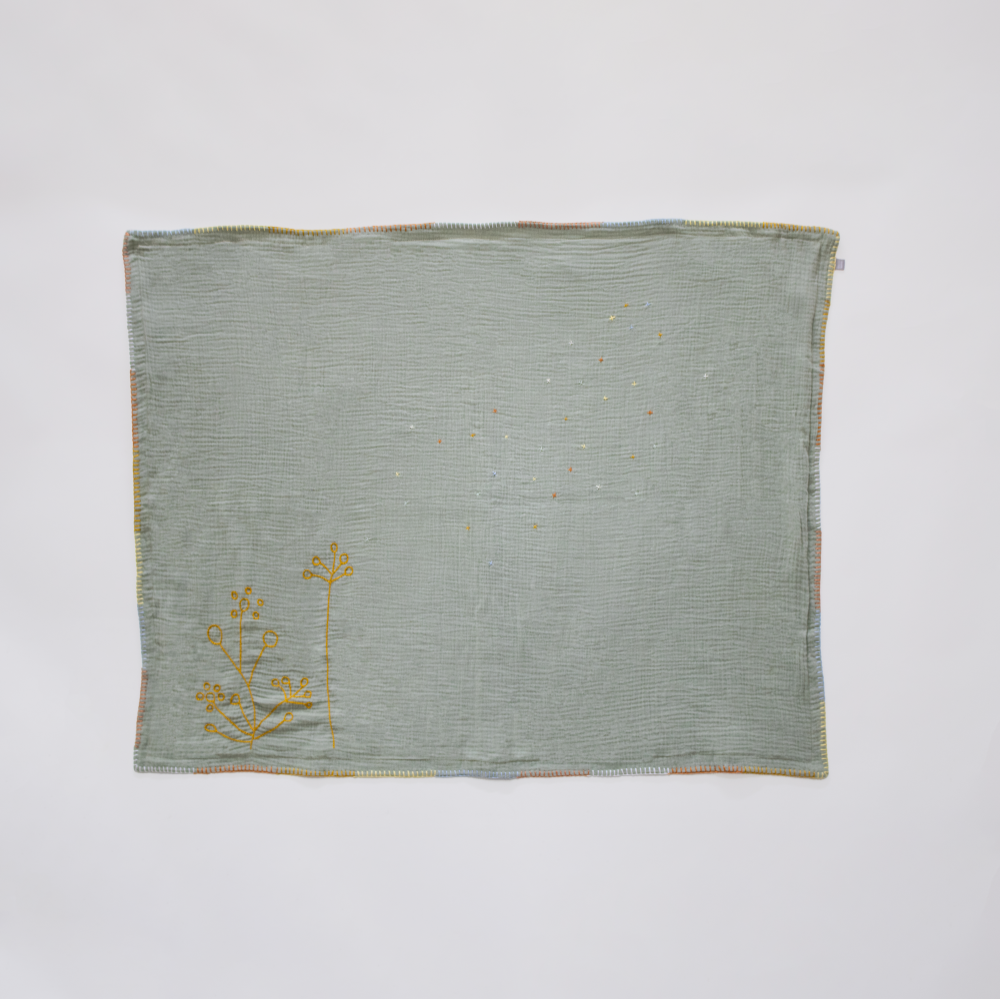 La Mantita Polen es un abrazo bordado que evoca el trabajo silencioso y vital de las abejas meliponas. Inspirada en su conexión con flores como la huaya, el roble y la amapola, esta manta acompaña con calidez los momentos de descanso de tu bebé.