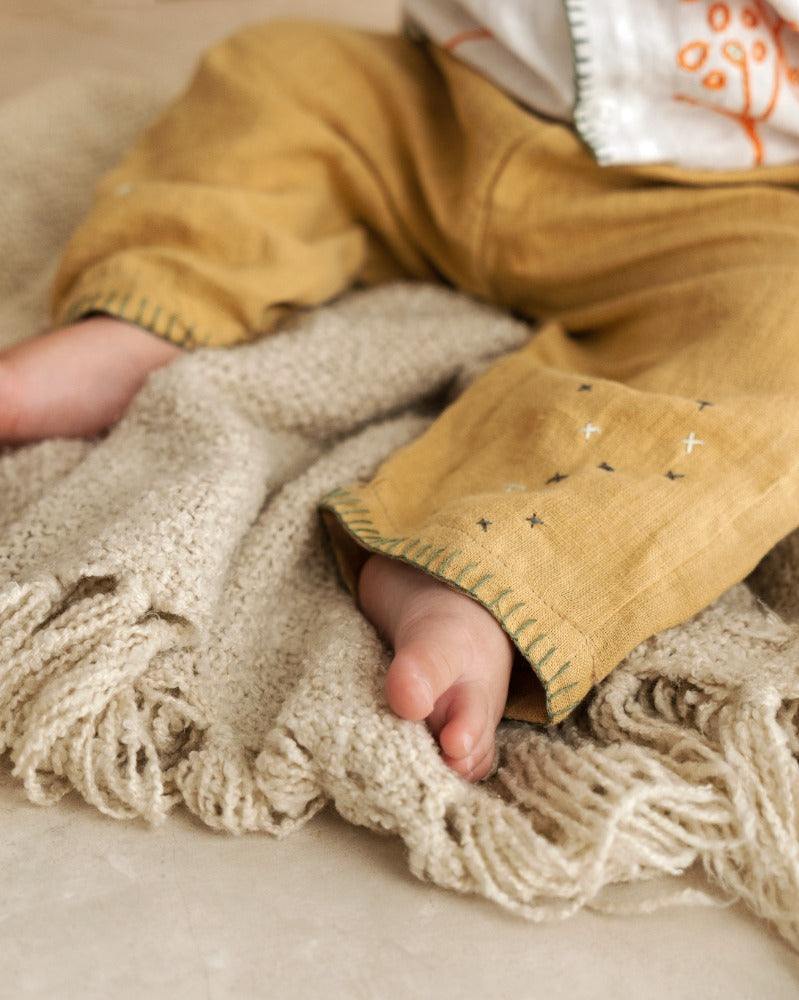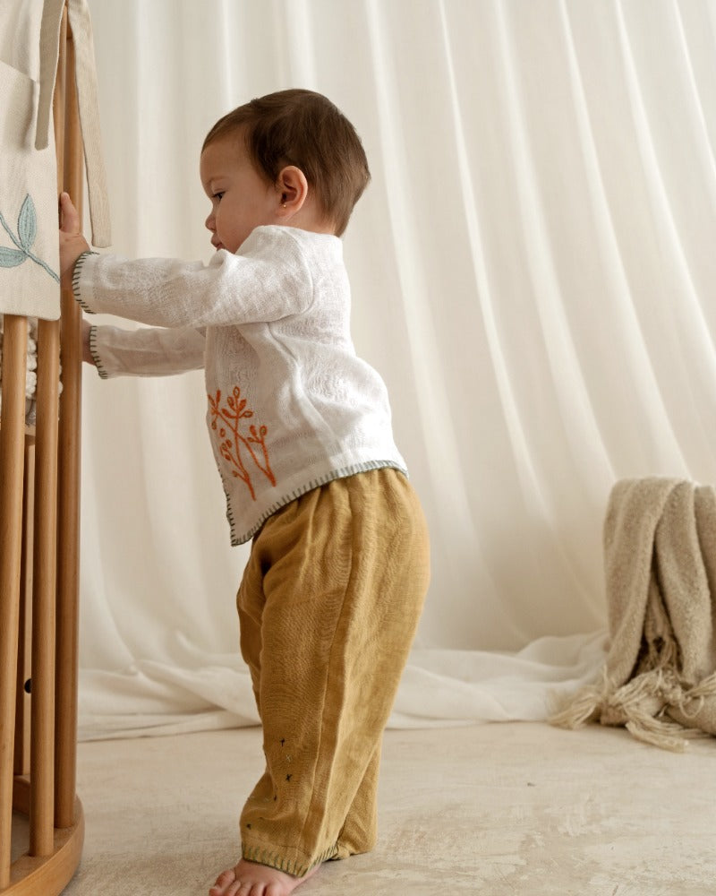 Confeccionado por artesanas de Temozón Sur y Tixcacaltuyub, este pantalón está pensado para acompañar la comodidad y el crecimiento de tu bebé. Forma parte de una colección versátil, diseñada para mezclarse libremente con otras prendas y crear atuendos únicos, suaves y llenos de significado.