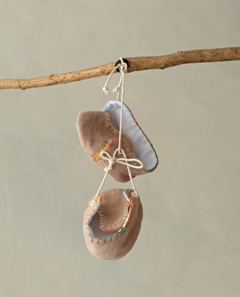 Cada par está inspirado en las abejas meliponas y las flores que polinizan, llevando en su diseño la belleza de la naturaleza maya. Confeccionados en lino y forrados con jersey blanco, estos zapatitos aportan un toque de ternura artesanal al primer guardarropa del bebé.